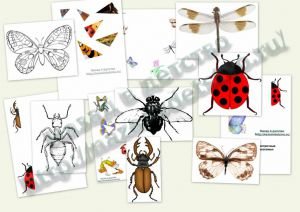 Перед занятием вырежьте симметричные половинки насекомых. Это упражнение на развитие восприятия и развитие мелкой моторики руки.
